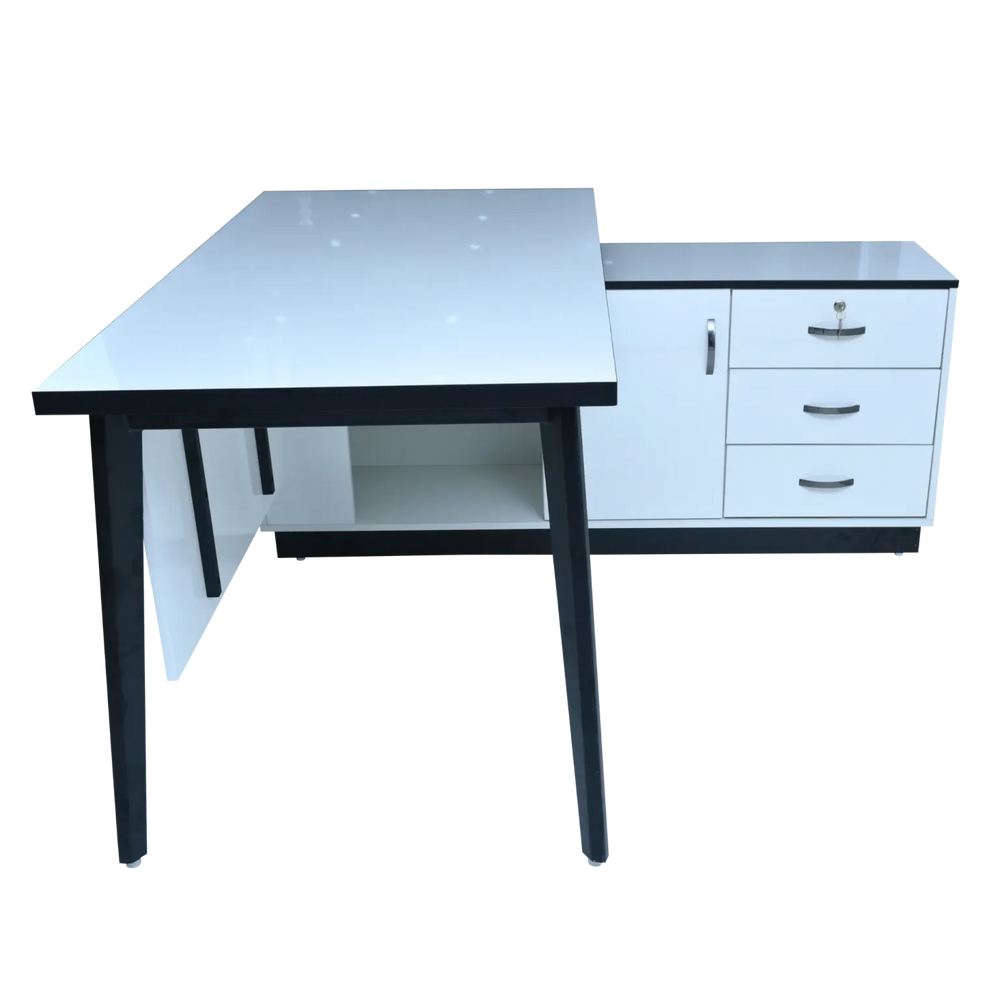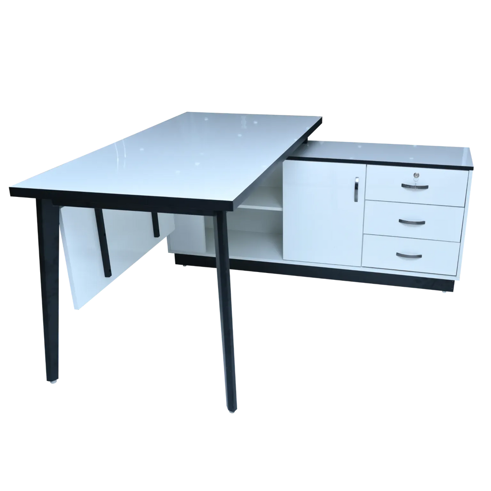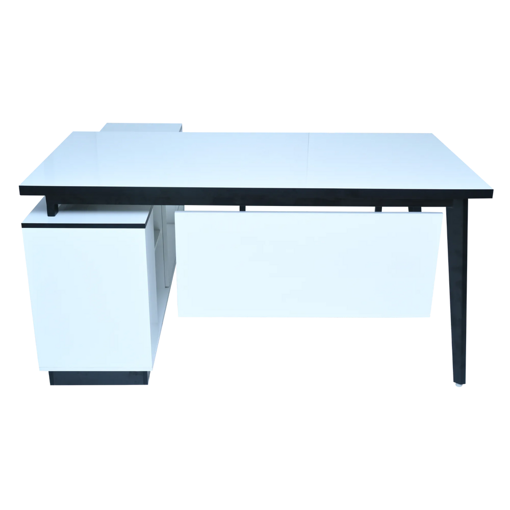 The ML-33 L-Shaped Office Desk delivers a striking, professional look with its high-contrast color scheme, perfect for modern offices, executive suites, or stylish home environments. This desk features a clean, bright white finish on the desktop and storage units, beautifully offset by a matte black or dark grey metal frame and base.