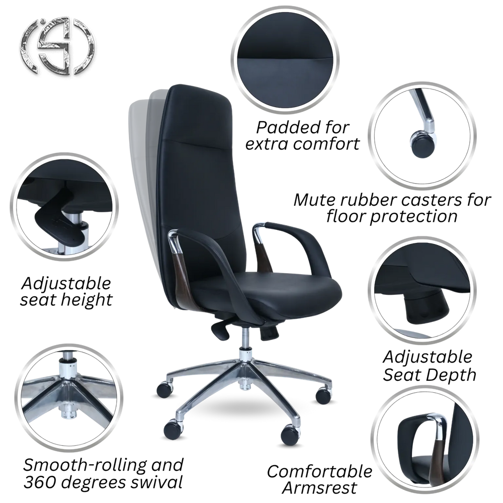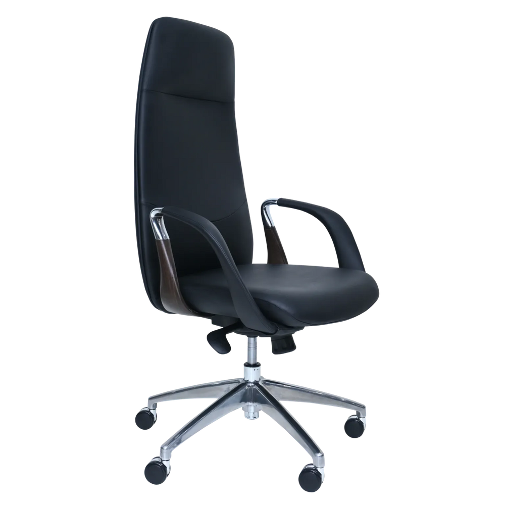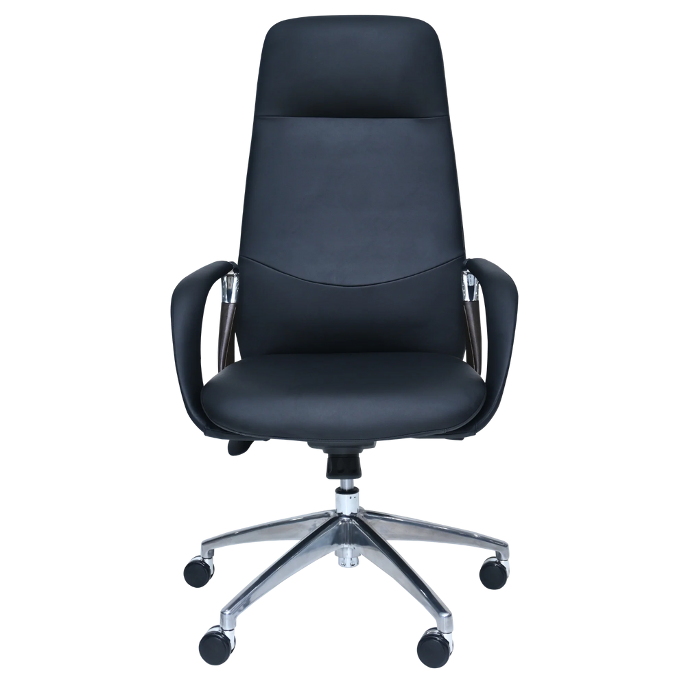 Make a statement in your office with this sleek, high-back executive chair. Its contoured design and generous padding for extra comfort offer superior support for your back and head. The design is enhanced by Comfortable Armrests that feature elegant, wood-look accents.
