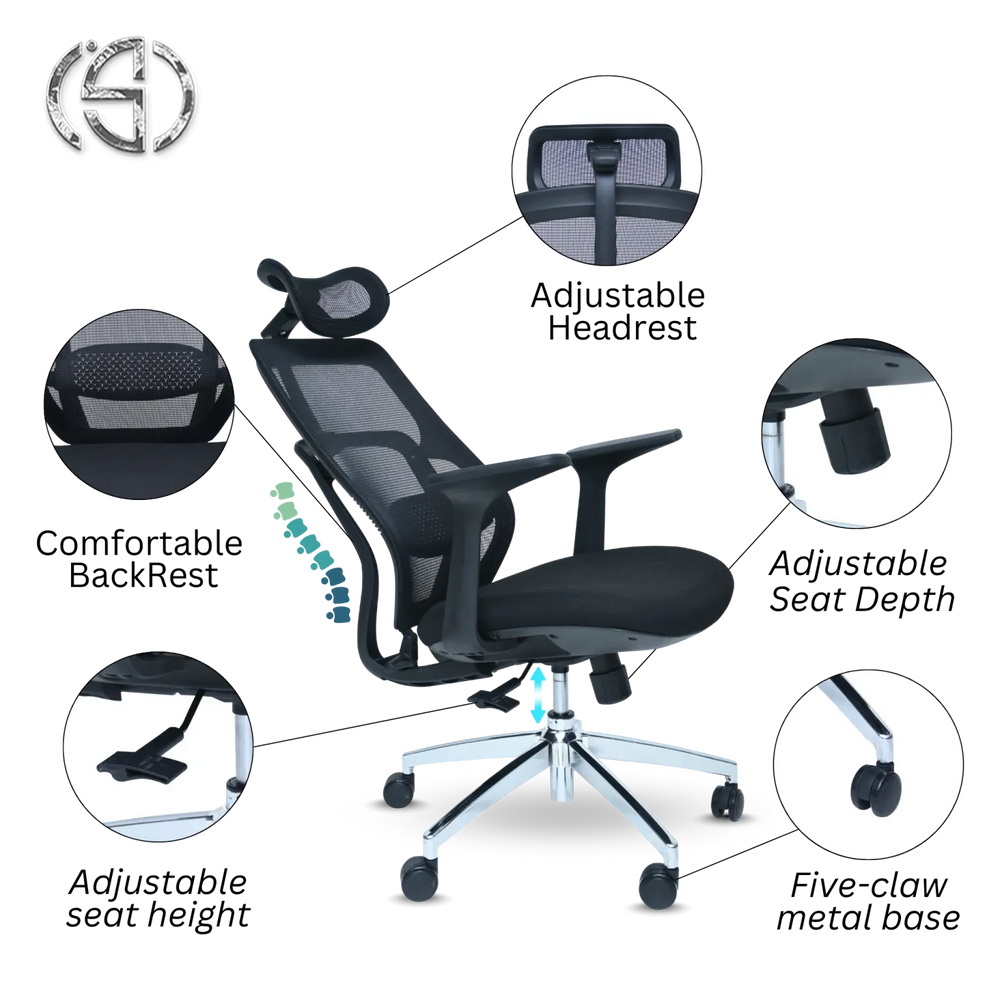 Achieve your perfect seating position with effortless adjustments, including an Adjustable Headrest for neck comfort, precise Adjustable seat Height, and tailored Adjustable Seat Depth. The chair is built on a strong Five-claw metal base, ensuring stability and smooth movement across your workspace. This chair is an ideal choice for anyone seeking a combination of breathability, comprehensive adjustability, and reliable support.