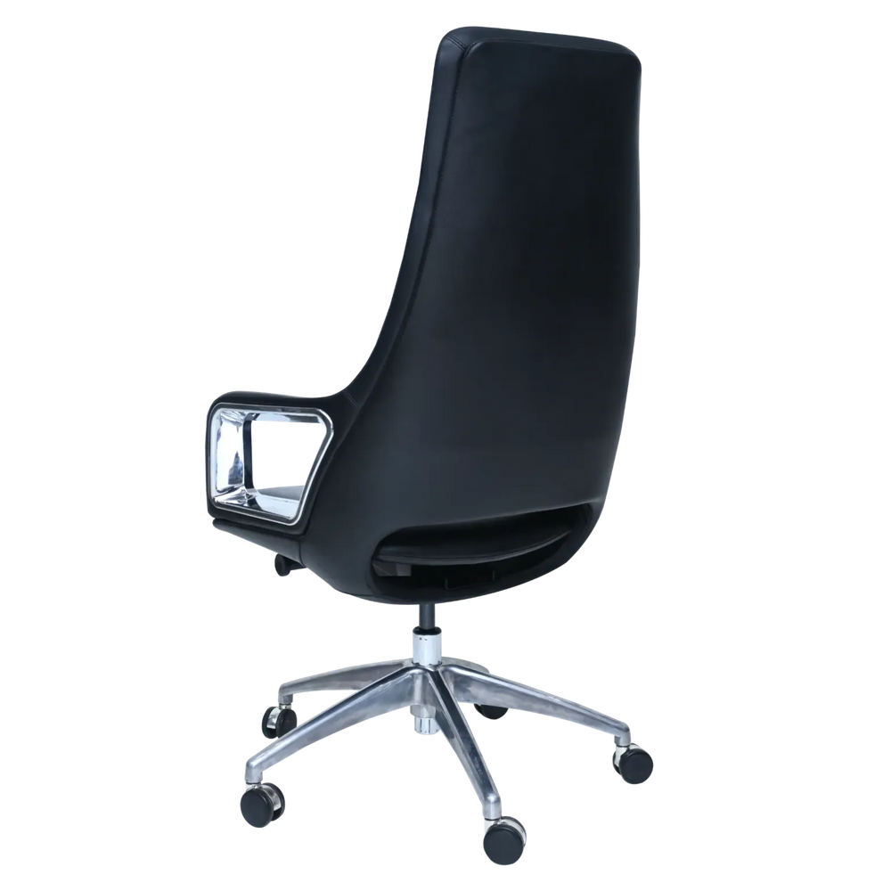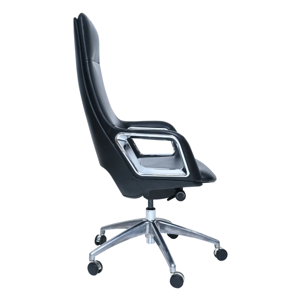 Elevate your office aesthetic with this modern executive chair. Its sleek, high-back design and ample padding for extra comfort provide excellent support and a sophisticated look. The distinctive open, rectangular chrome armrests add a contemporary flair while offering comfortable support.