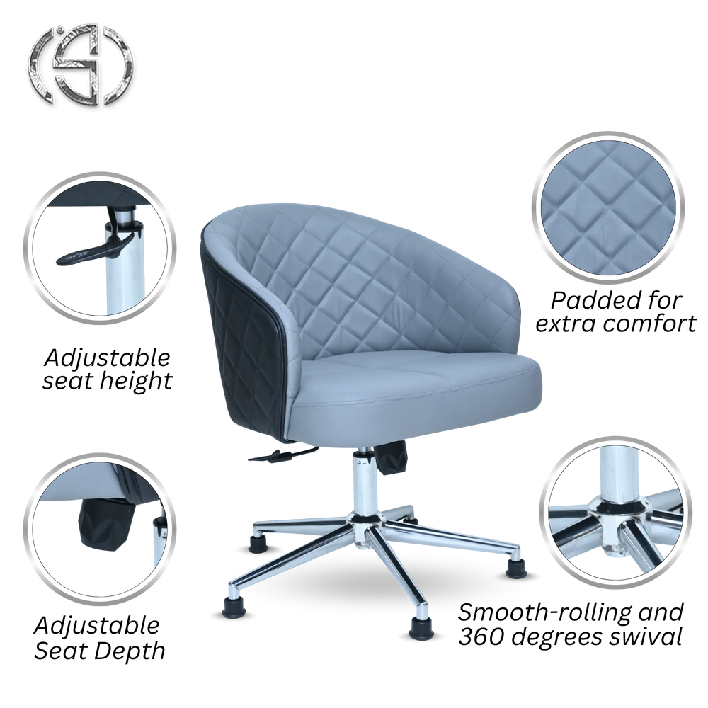 Despite its compact and stylish form, it offers practical ergonomic adjustments: easily modify the Adjustable seat height and fine-tune your support with the Adjustable Seat Depth. The chrome base provides both stability and effortless movement, featuring a Smooth-rolling and 360 degrees swivel for ultimate flexibility. This chair perfectly blends aesthetic appeal with functional design.