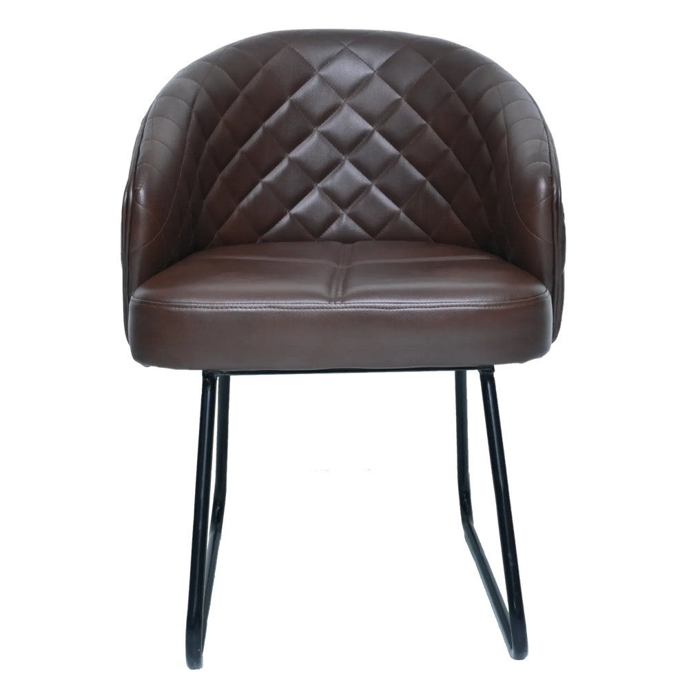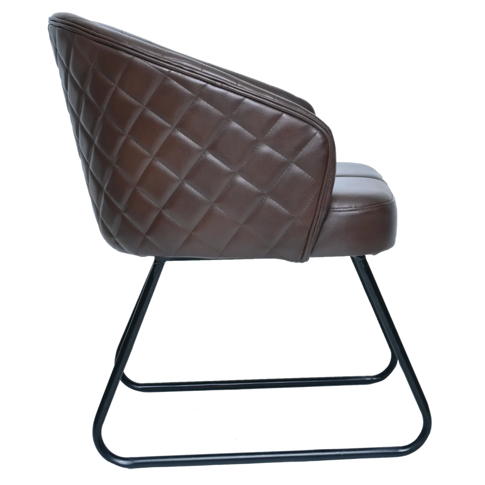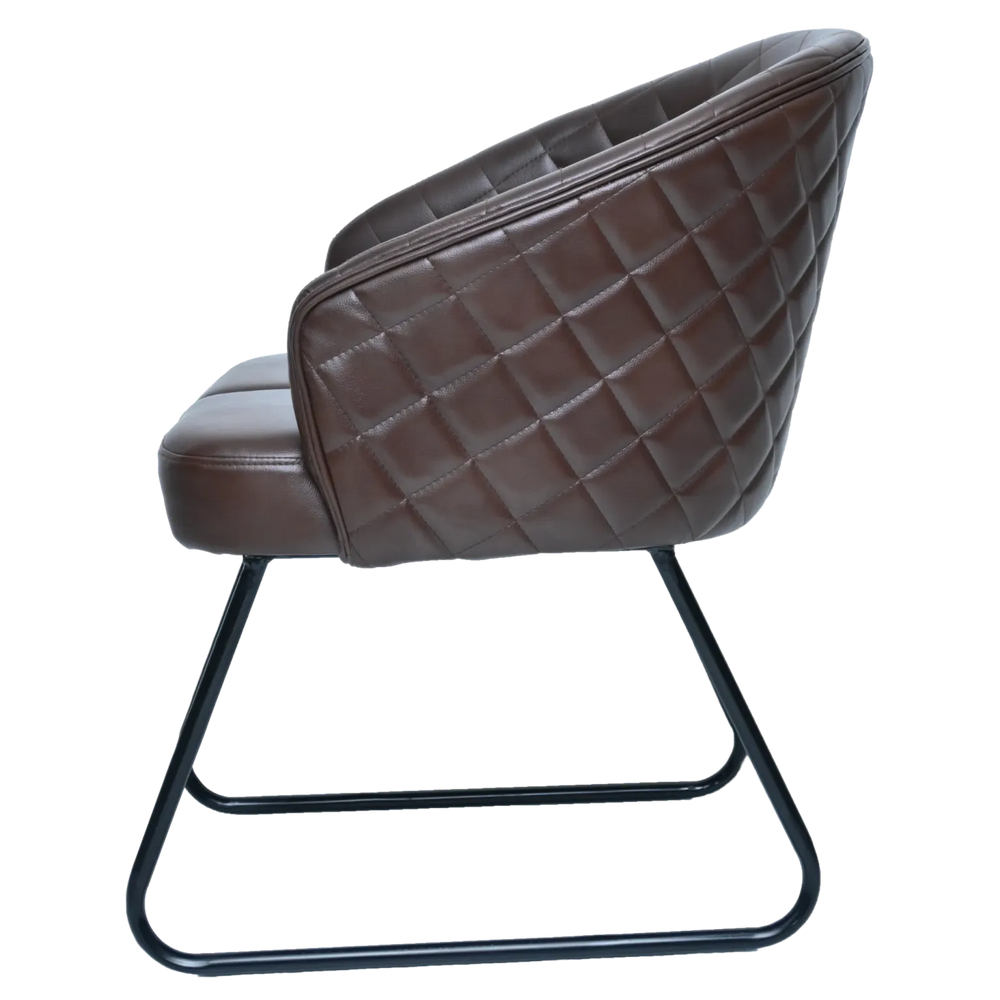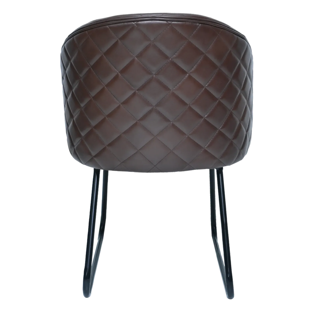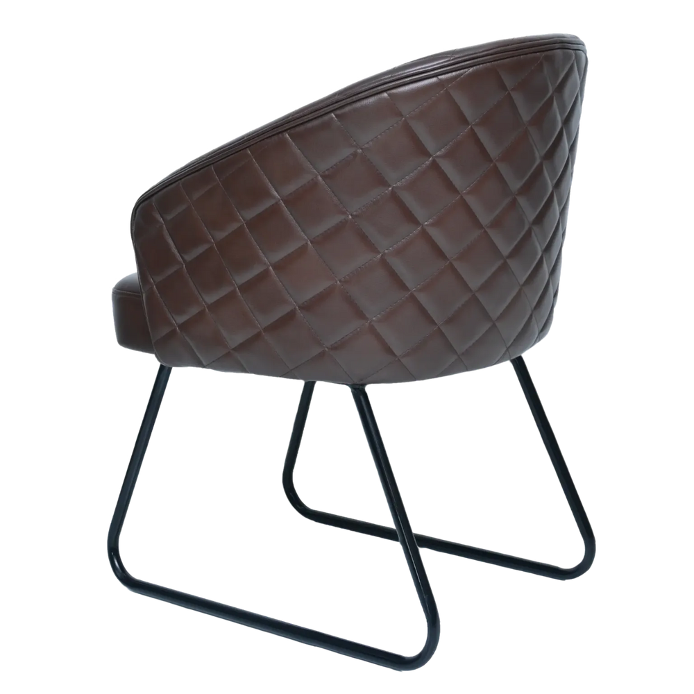 This chair features premium, rich brown upholstery with a distinctive diamond-quilted (tufted) pattern that runs across the entire barrel-style backrest. This detailing provides both a high-end texture and structural support. The generous padding on the seat and back ensures a comfortable sit, even for extended periods.